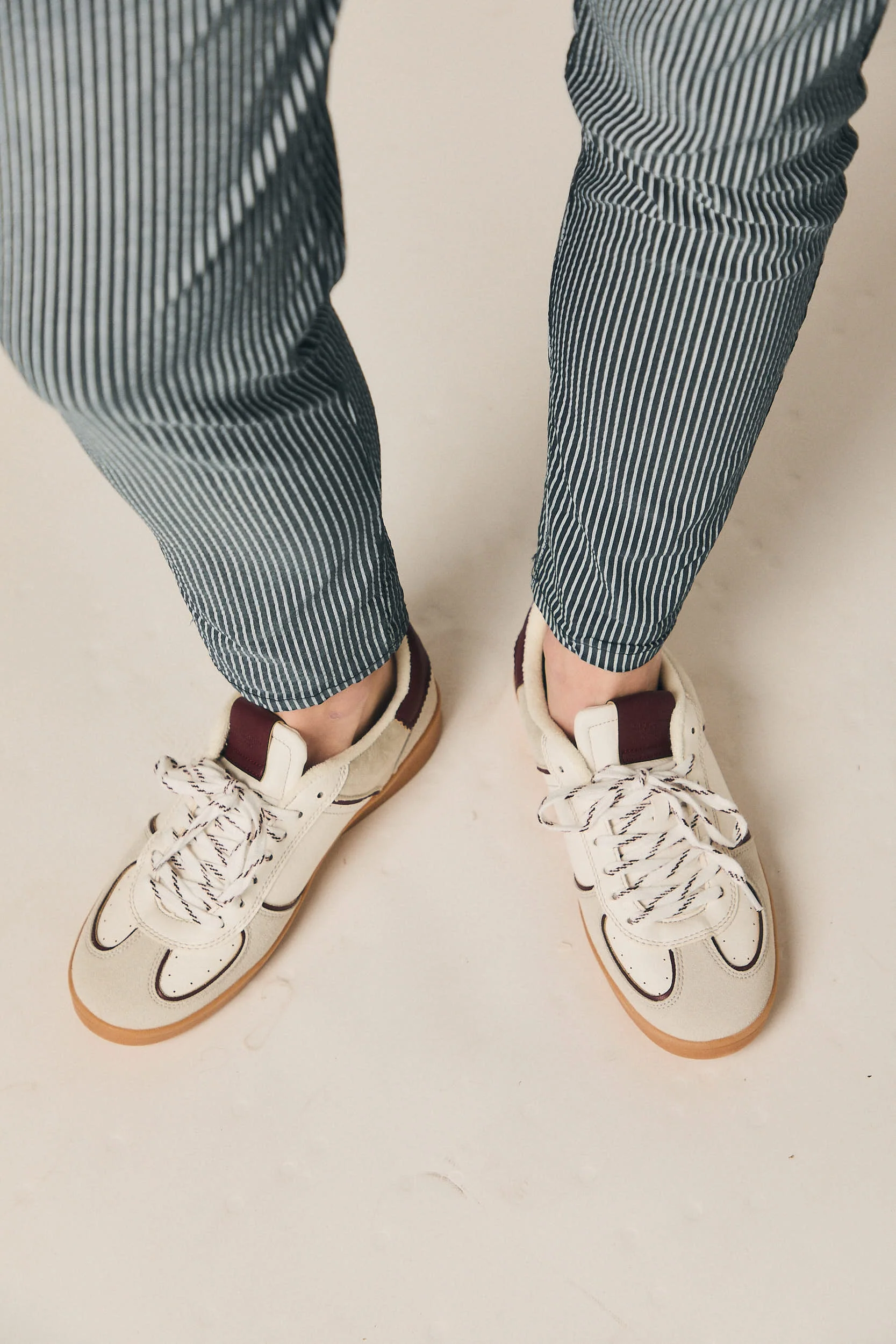 Zapatilla deportiva en tonos crudo y beige con detalles en contraste burdeos. Diseño combinado con puntera reforzada, laterales con doble raya y cierre de cordones. Talón y lengüeta en burdeos que aportan carácter, junto a suela caramelo que equilibra el conjunto.