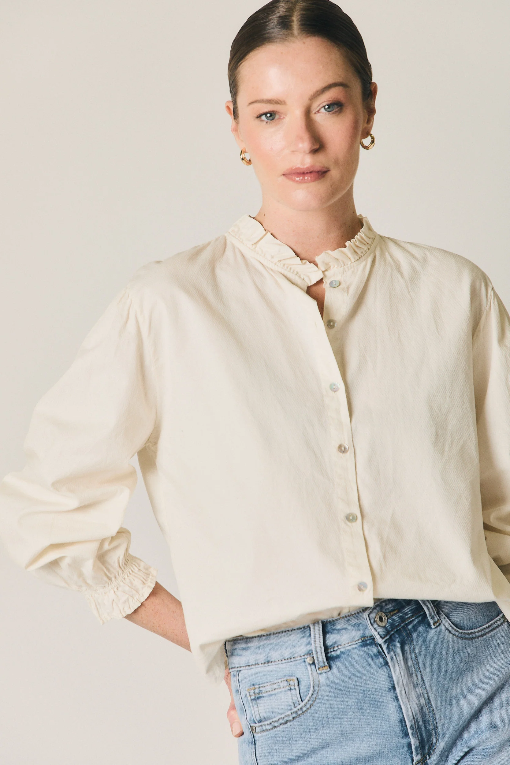Blusa en color crudo con cuello mao y detalle de volantes sutiles. Diseño de manga larga con puño fruncido y cierre de botones que aporta un acabado limpio y cuidado. Una prenda ligera y fluida, pensada para el entretiempo y el adelanto de primavera.