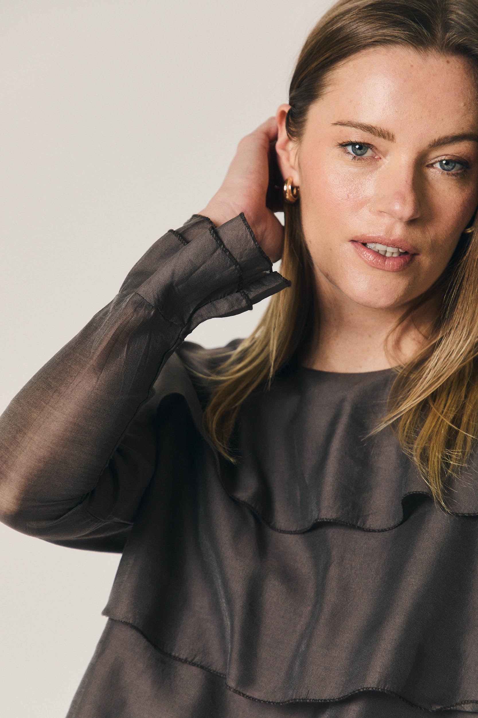 Blusa ligera en tono marrón con diseño de capas superpuestas que aportan movimiento y un acabado delicado. Cuello redondo, manga larga ligeramente transparente y bajo recto que define la silueta sin ajustarla. El juego de volúmenes crea una prenda sutil y equilibrada, pensada para aportar textura visual al look.