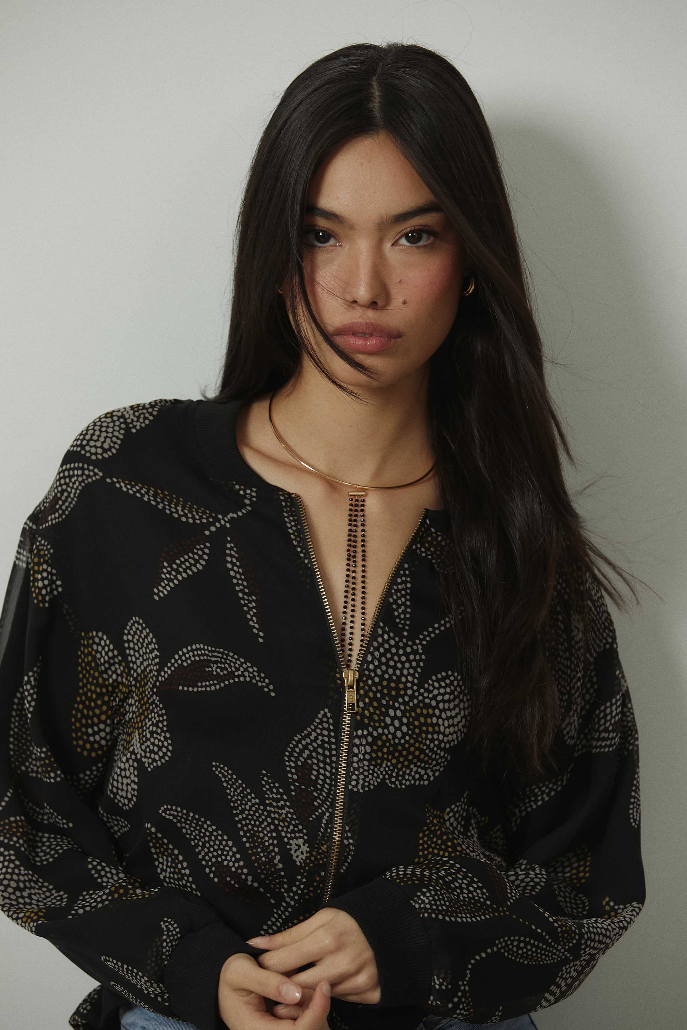 Bomber ligera con estampado floral en tono negro. Diseño de manga larga con volumen suave y cierre frontal de cremallera metálica. Presenta cintura ajustable con cordón que permite regular la silueta y crear un efecto ligeramente blusado. El estampado floral aporta contraste y profundidad sobre fondo oscuro, manteniendo un equilibrio entre prenda exterior y pieza protagonista del look.