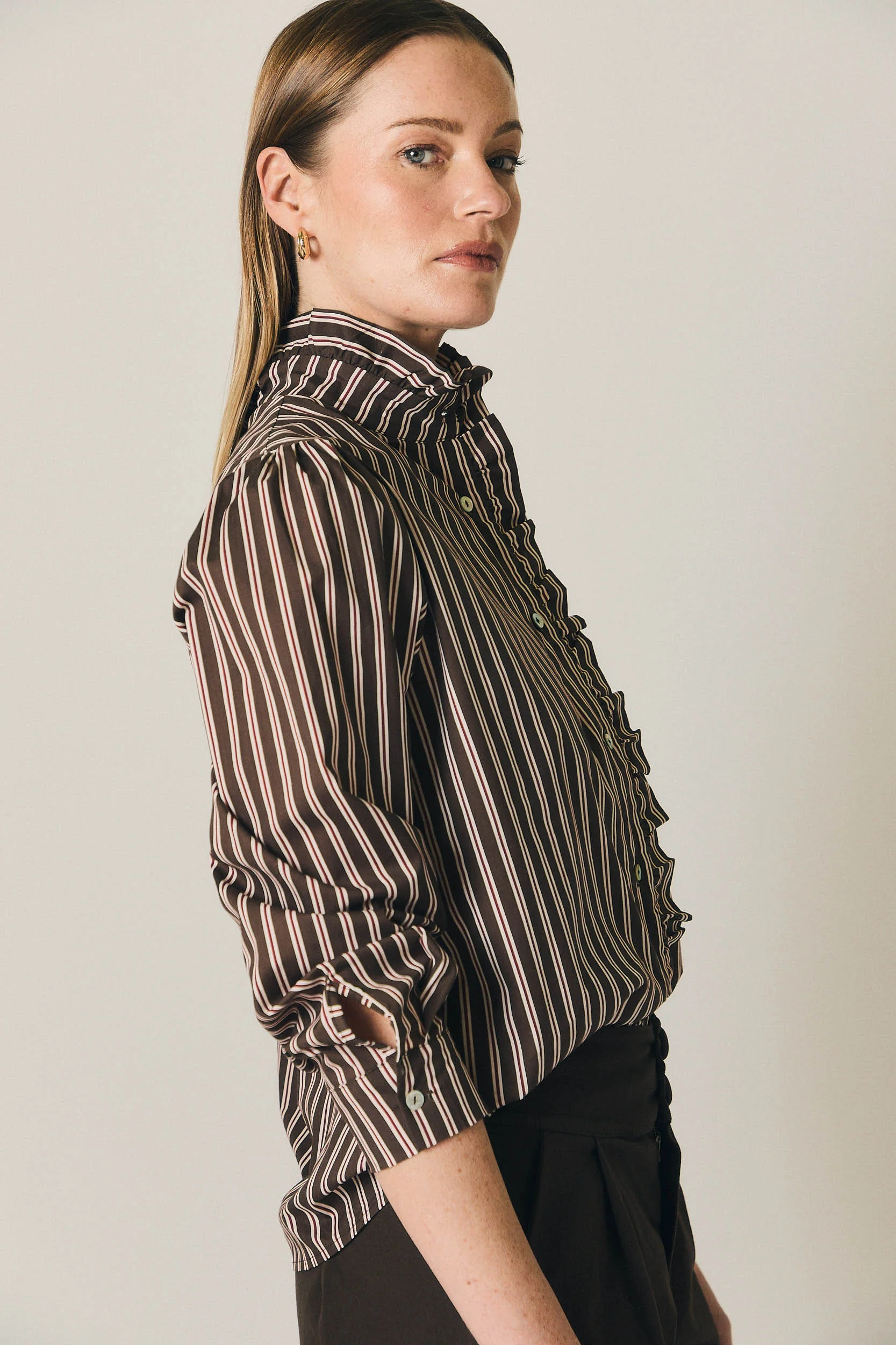 Camisa de rayas en tono marrón con cuello fruncido de gomas que aporta un acabado delicado y estructurado. Diseño de corte recto, cierre frontal con botones y manga larga con ligero volumen en el hombro y puño. El estampado de rayas verticales estiliza y aporta un aire clásico renovado.
