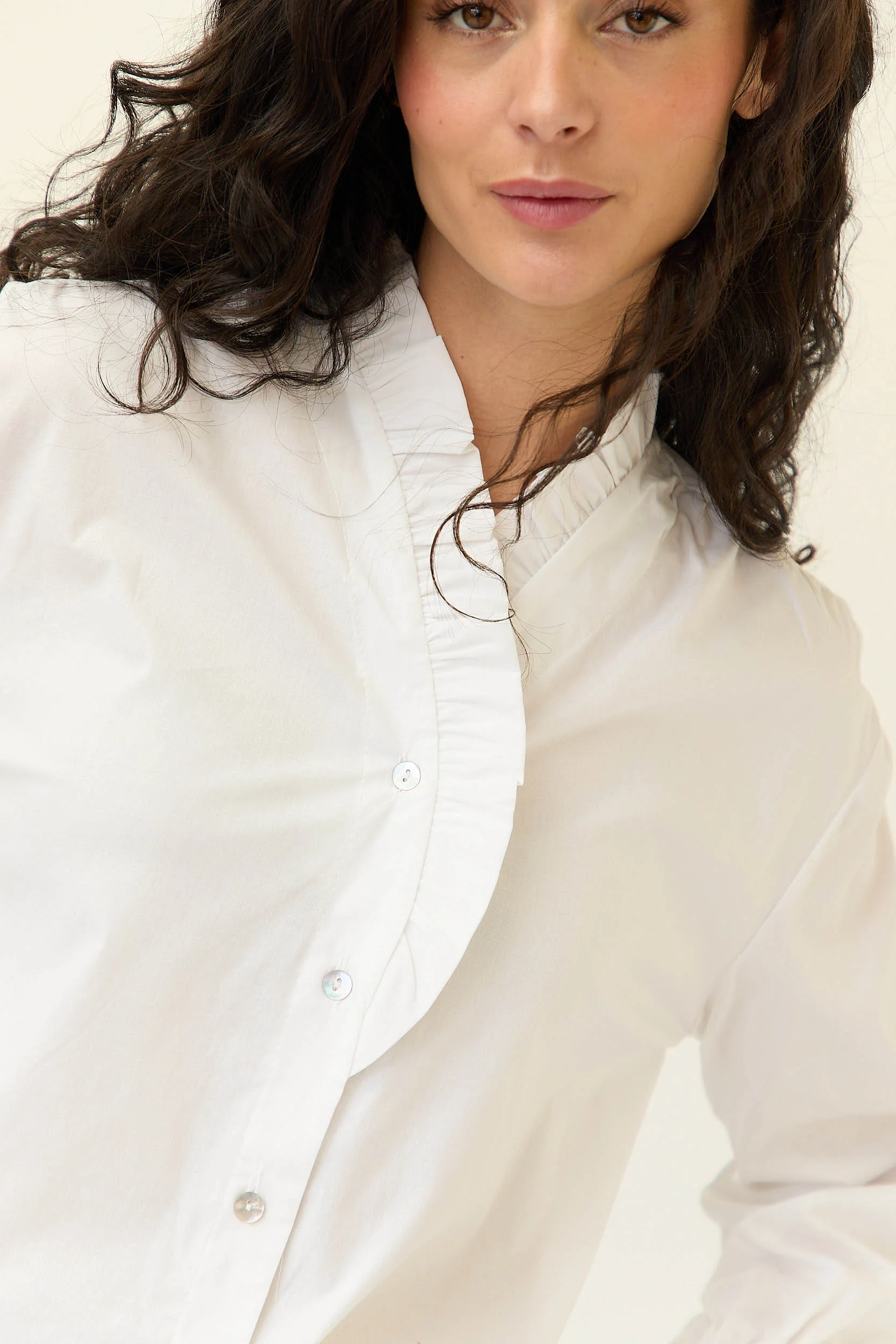 Camisa blanca de corte recto con escote en pico y detalle de volante continuo en el contorno del cuello y la botonadura. Cierre frontal con botones. Mangas largas con ligero volumen y puño elástico fruncido que aporta movimiento al diseño.