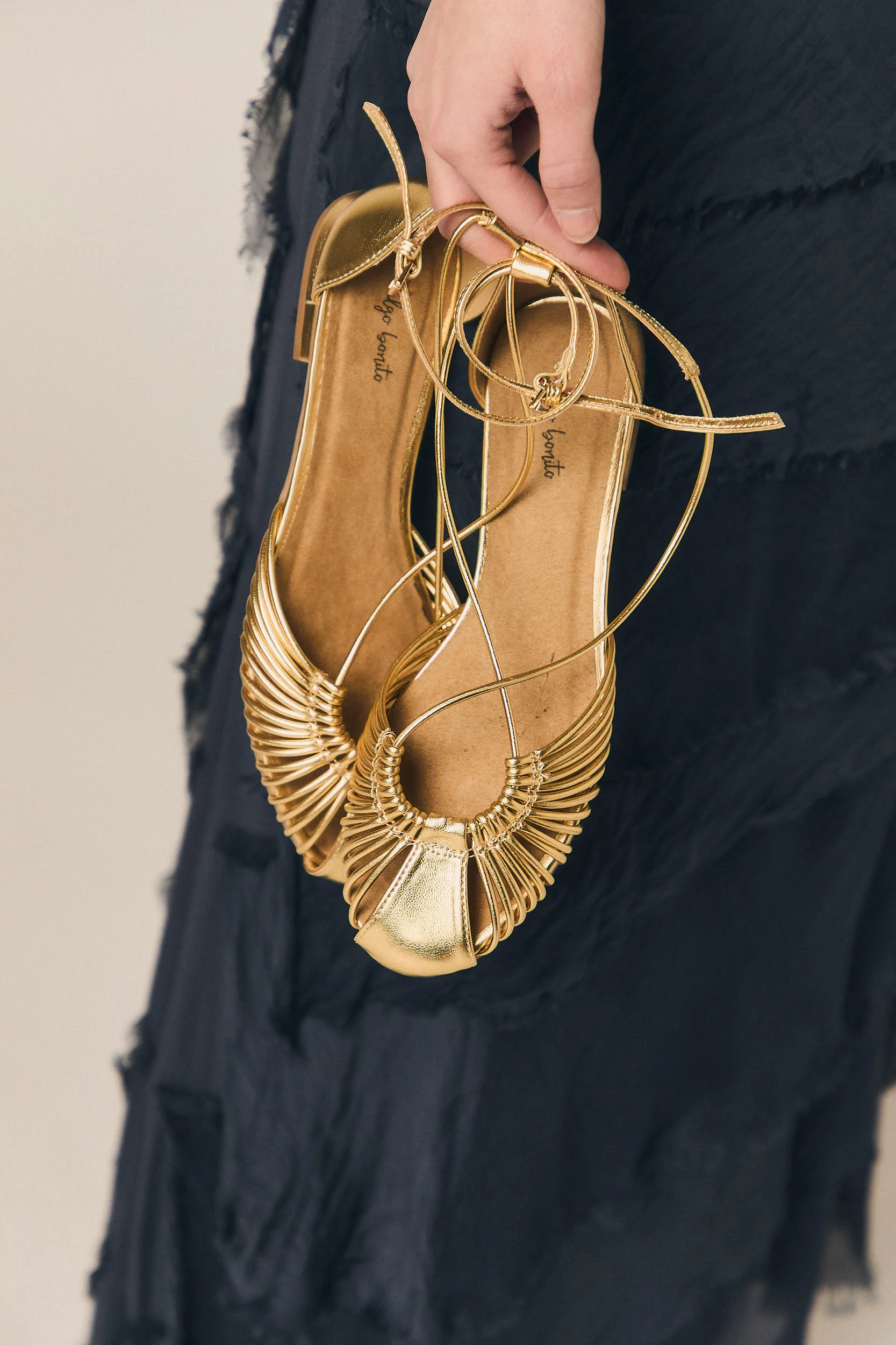 Sandalia tipo cangrejera en tono dorado con diseño de tiras finas entrelazadas que envuelven el empeine. Cierre con lazada al tobillo que permite ajustar y estilizar la pierna, aportando un acabado más especial.