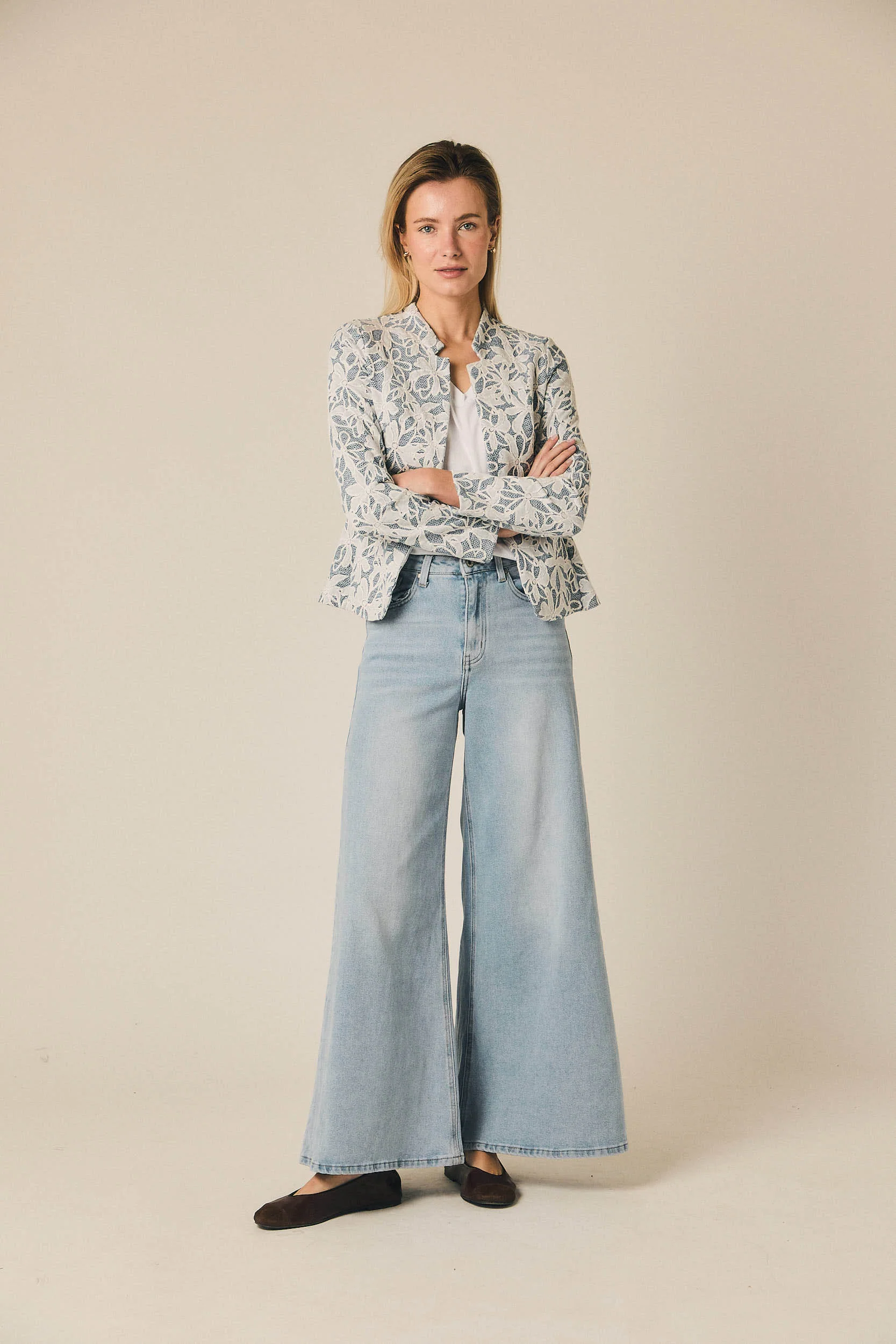 Chaqueta de manga larga con diseño estructurado y cuello redondo abierto. Presenta un encaje floral en tono crudo sobre fondo azul que crea contraste y textura en toda la prenda. Su corte recto y el bajo ligeramente redondeado aportan una silueta limpia y ligera.