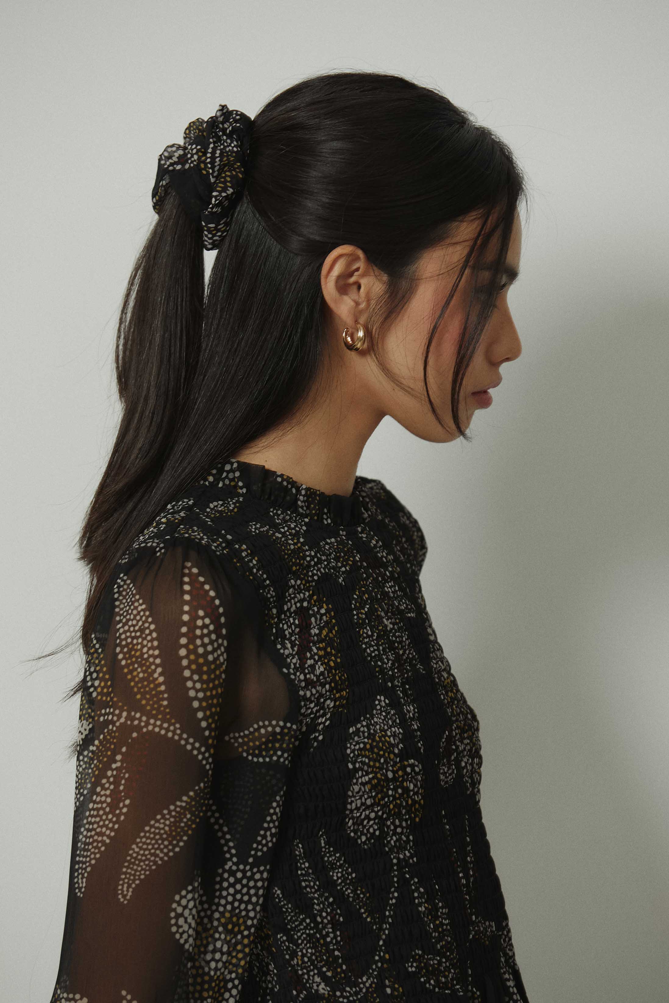 Coletero de gasa con estampado floral de dots en tonos contrastados sobre fondo negro. Diseño fruncido, ligero y con volumen, pensado para recoger el cabello sin tirantez y aportar un detalle coordinado al look.