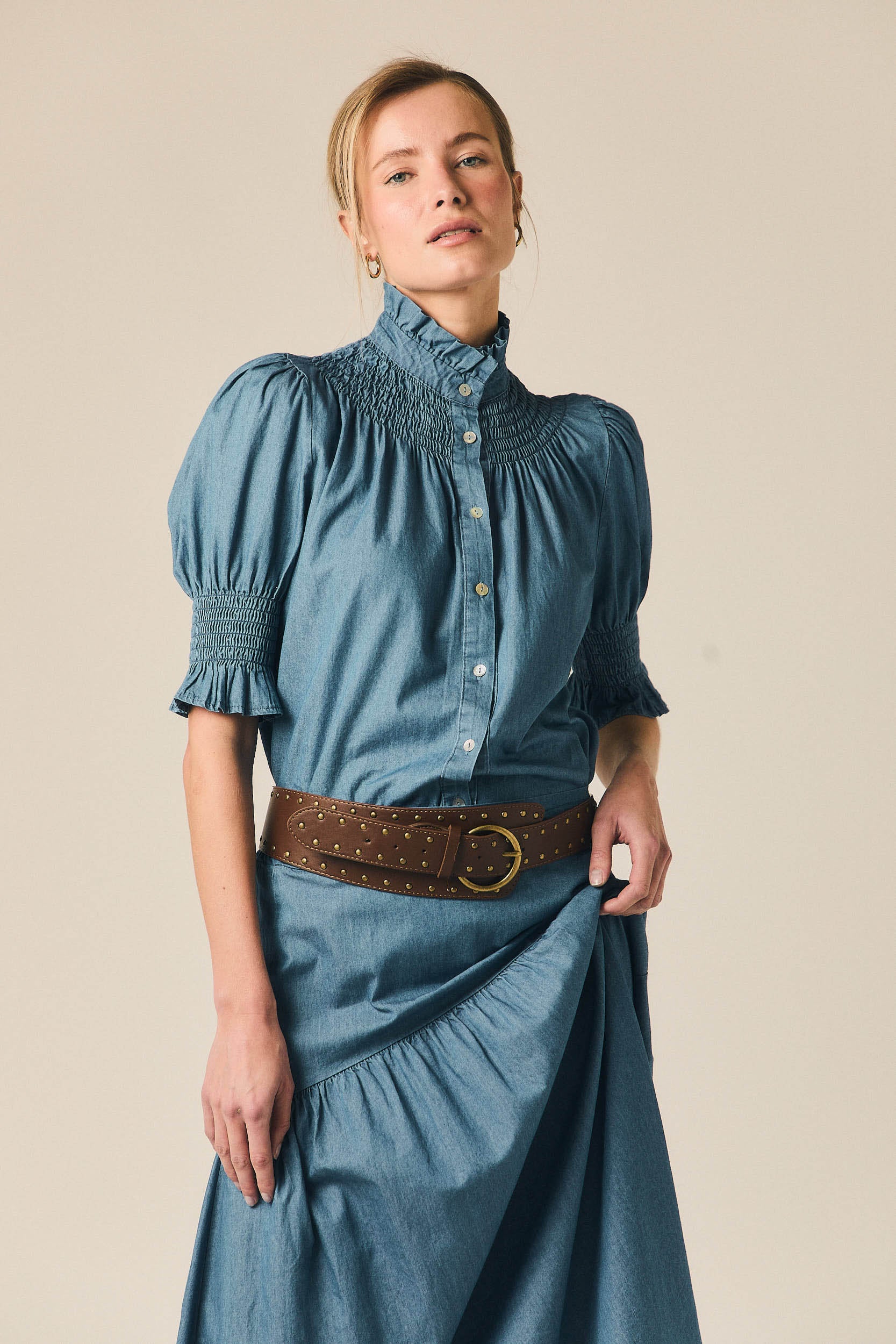 Falda larga chambray en tono azul. Presenta tiro medio con cintura limpia y corte evasé que se abre a partir de una costura horizontal con frunce suave, aportando volumen y movimiento al diseño. Su largo maxi y la caída fluida crean una silueta cómoda y favorecedora.