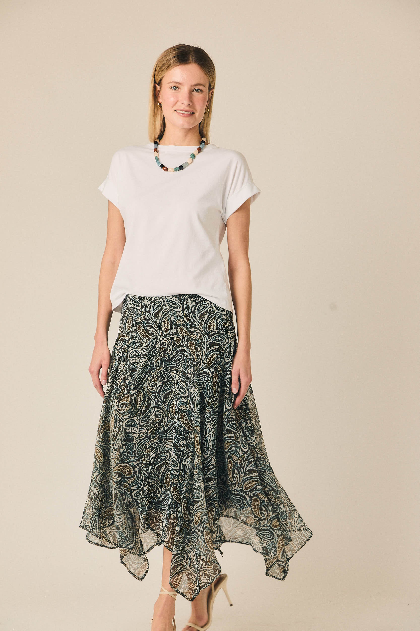 Falda midi de tejido ligero con estampado paisley en tonos verdes, beige y marrón. Presenta una silueta fluida con bajo irregular en picos que aporta movimiento al caminar. El tejido semitransparente crea un efecto ligero que acompaña la caída de la prenda.