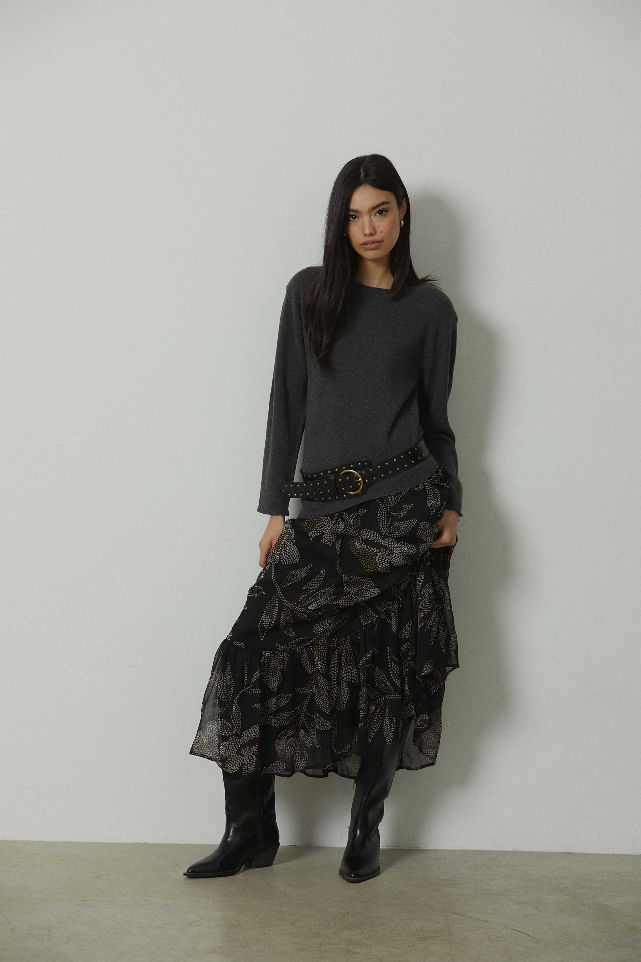 Una falda pensada para acompañarte tanto en looks de diario como en planes de tarde. Funciona muy bien con jerseys finos, camisetas ajustadas o tops de tul, y se adapta fácilmente a botas, botines o calzado plano. Una prenda versátil que suma textura y profundidad sin resultar recargada.