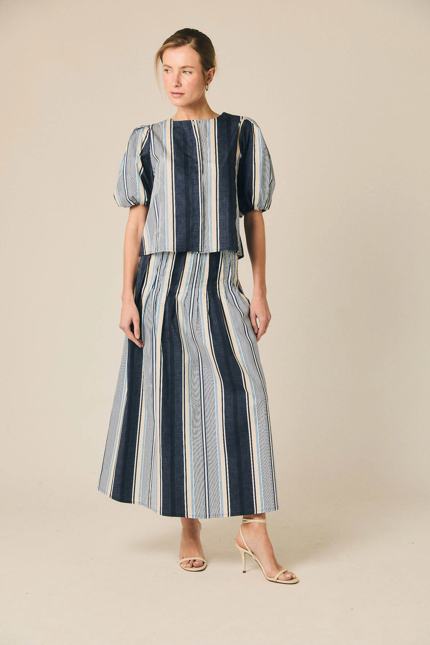 Falda midi de rayas verticales en azul marino, blanco y azul claro. Presenta tiro medio-alto, cintura limpia y silueta evasé con caída fluida que aporta movimiento. Su diseño largo midi estiliza y alarga visualmente la figura, convirtiéndola en una falda fresca y favorecedora para el día a día.