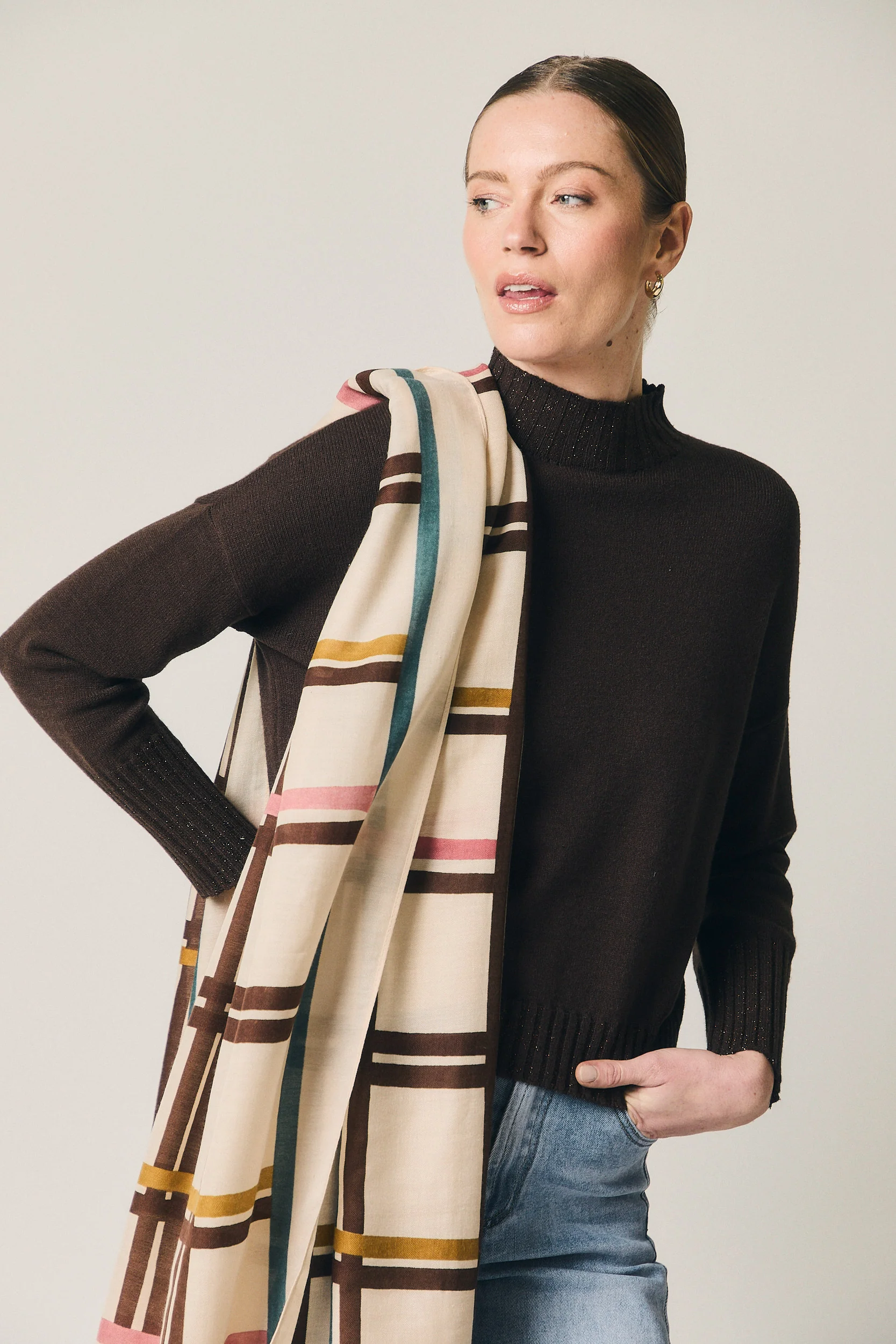 Foulard largo en tono crema con estampado de cuadros en contraste, combinando líneas en marrón, verde y toques rosados. Formato alargado y ligero, con acabado de bordes desflecados que aporta un aire natural y desenfadado. Su tamaño permite llevarlo enrollado al cuello, suelto sobre los hombros o como complemento sobre prendas de abrigo.