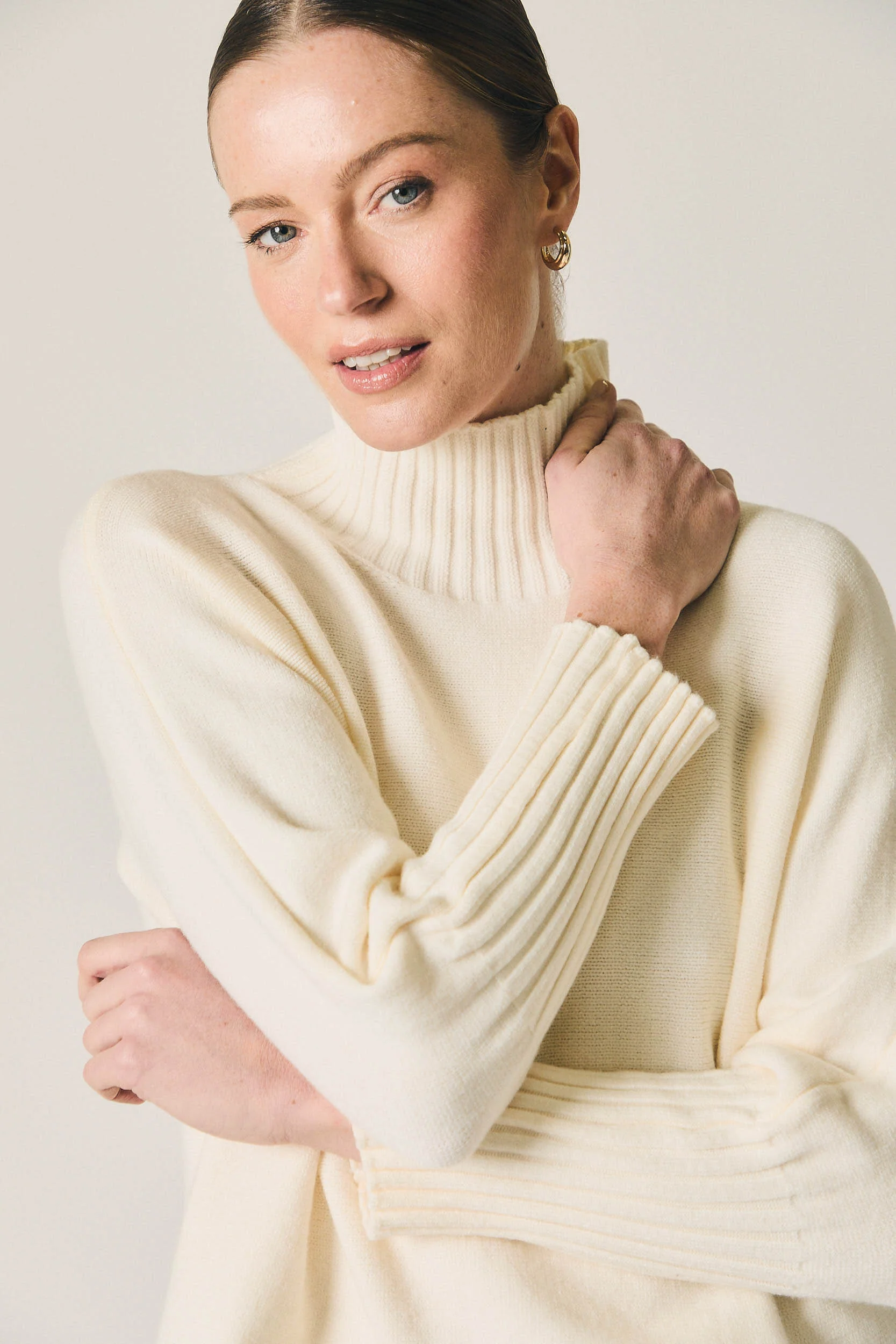 Jersey en tono crudo de corte recto y silueta relajada. Presenta cuello alto con acabado en canalé y mangas largas con el mismo detalle, que aportan estructura y contraste al diseño liso del cuerpo. El bajo recto y la caída natural lo convierten en una prenda cómoda y fácil de integrar en el armario diario.