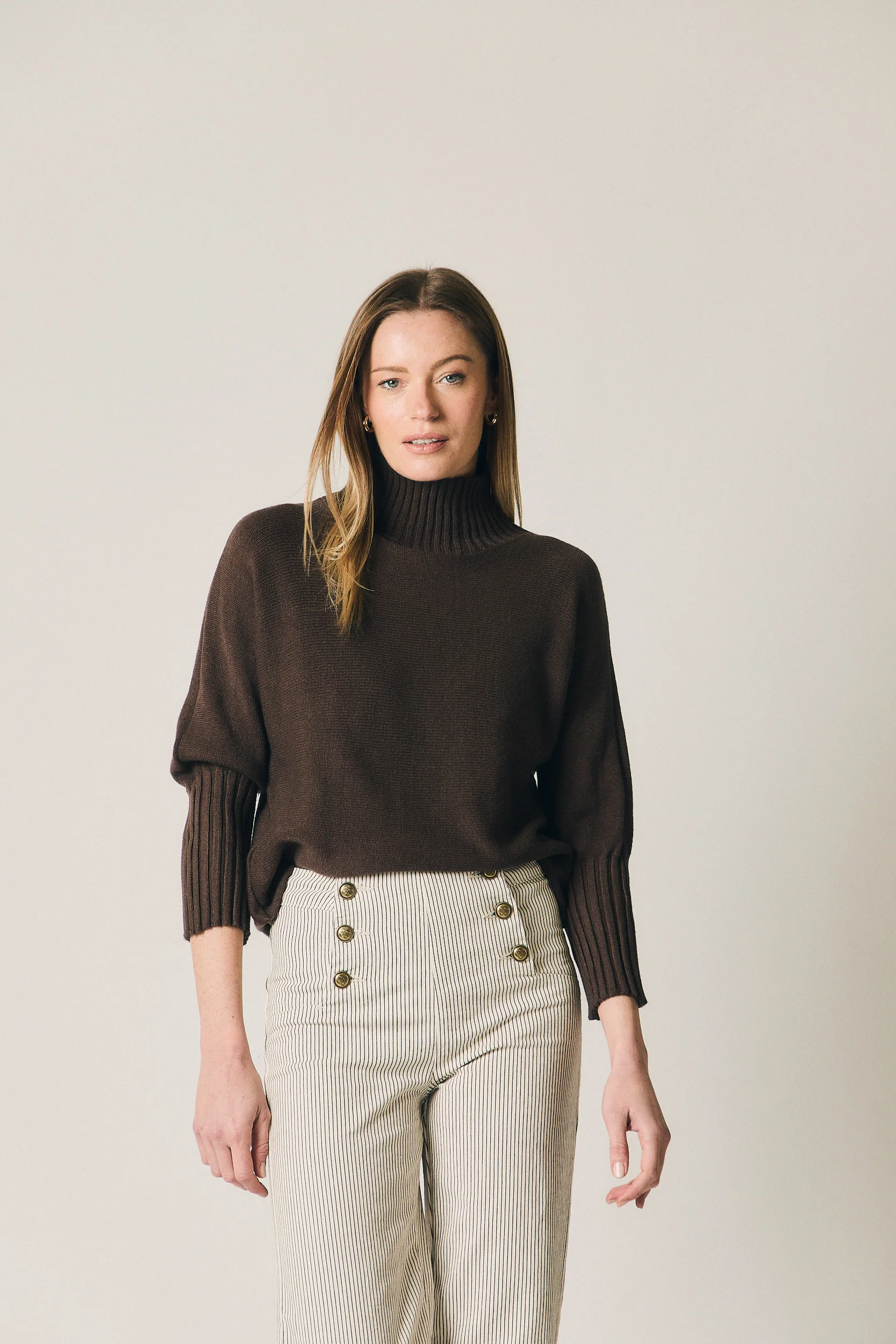 Jersey en tono marrón de corte recto y silueta relajada. Presenta cuello alto con acabado en canalé y mangas largas con el mismo detalle, que aportan estructura y contraste al diseño liso del cuerpo. El bajo recto y la caída natural lo convierten en una prenda cómoda y fácil de integrar en el armario diario.