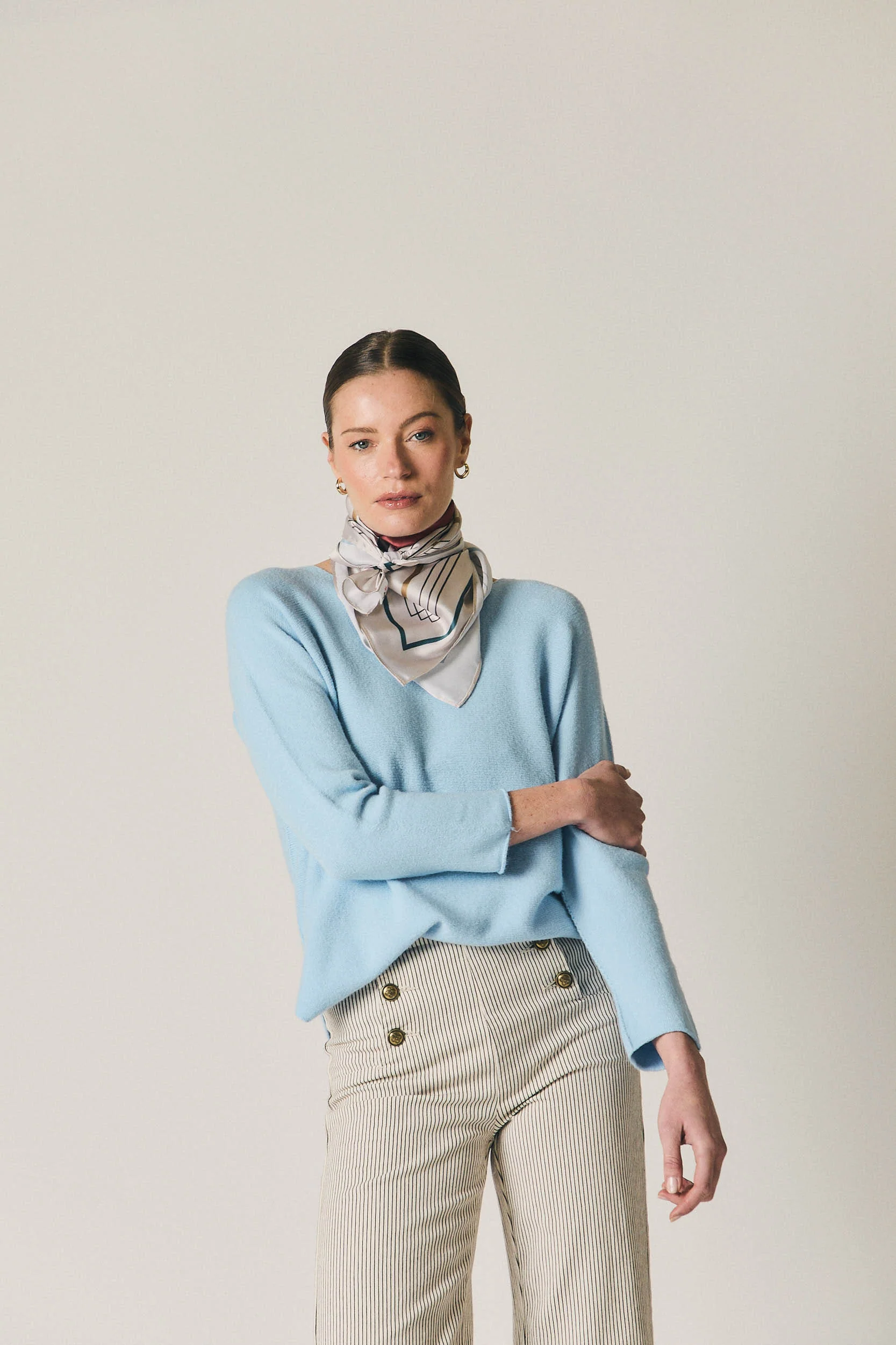 Jersey de punto en tono celeste, de corte recto y silueta relajada. Presenta cuello redondo amplio y mangas largas ligeramente caídas, con un acabado limpio y sin detalles añadidos que refuerza su carácter atemporal. El bajo recto permite llevarlo suelto o ligeramente metido, adaptándose con facilidad a distintos looks.