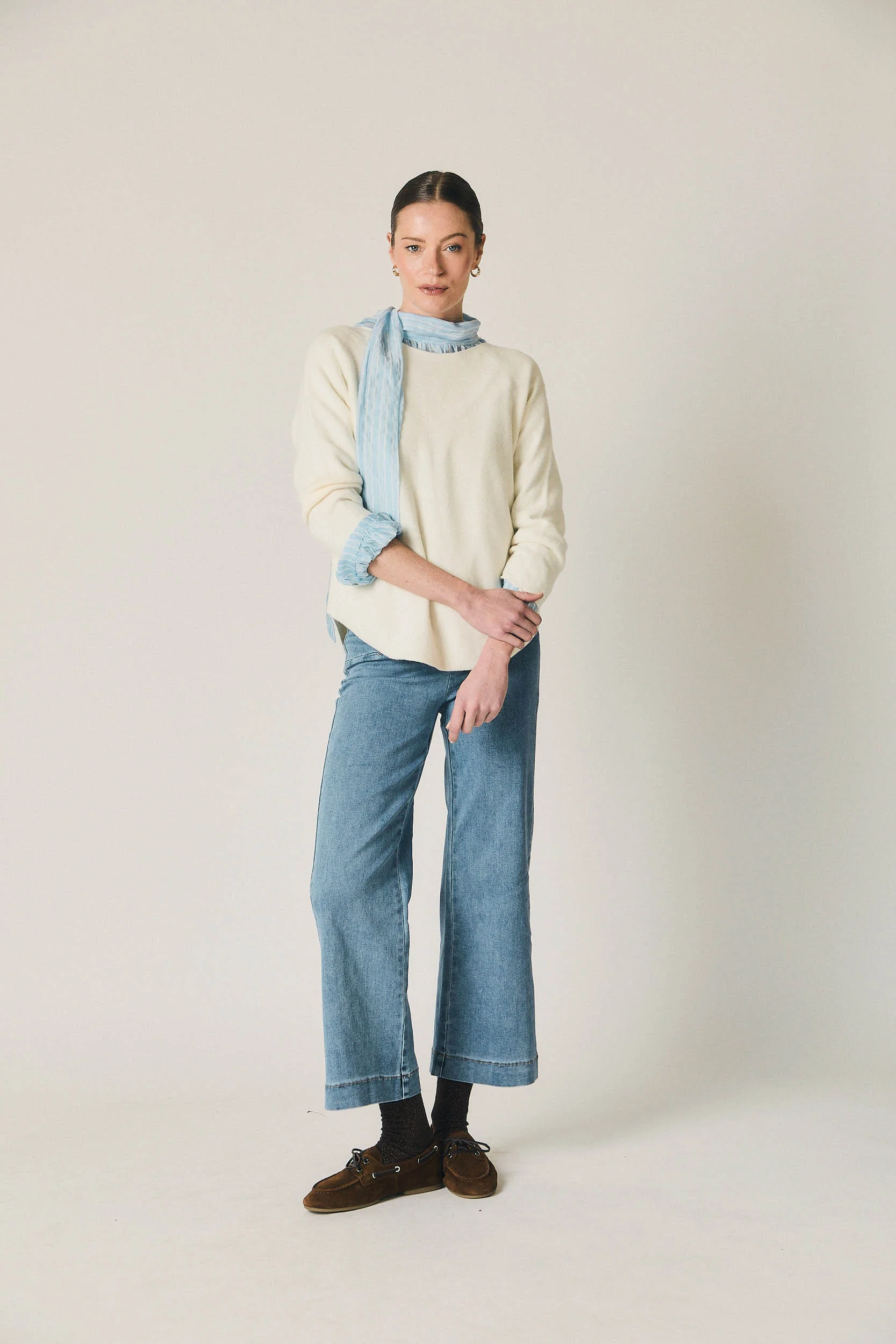 Jersey de punto en tono crudo, de corte recto y silueta relajada. Presenta cuello redondo amplio y mangas largas ligeramente caídas, con un acabado limpio y sin detalles añadidos que refuerza su carácter atemporal. El bajo recto permite llevarlo suelto o ligeramente metido, adaptándose con facilidad a distintos looks.