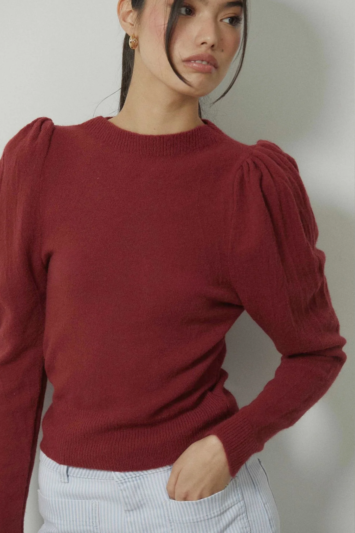 Jersey de punto en color teja con cuello redondo y manga larga tipo farol. Diseño ajustado en el cuerpo con volumen sutil en hombros y mangas, equilibrado por los acabados elásticos en puños y bajo. Una prenda cómoda y favorecedora, pensada para el entretiempo y los primeros looks de primavera.