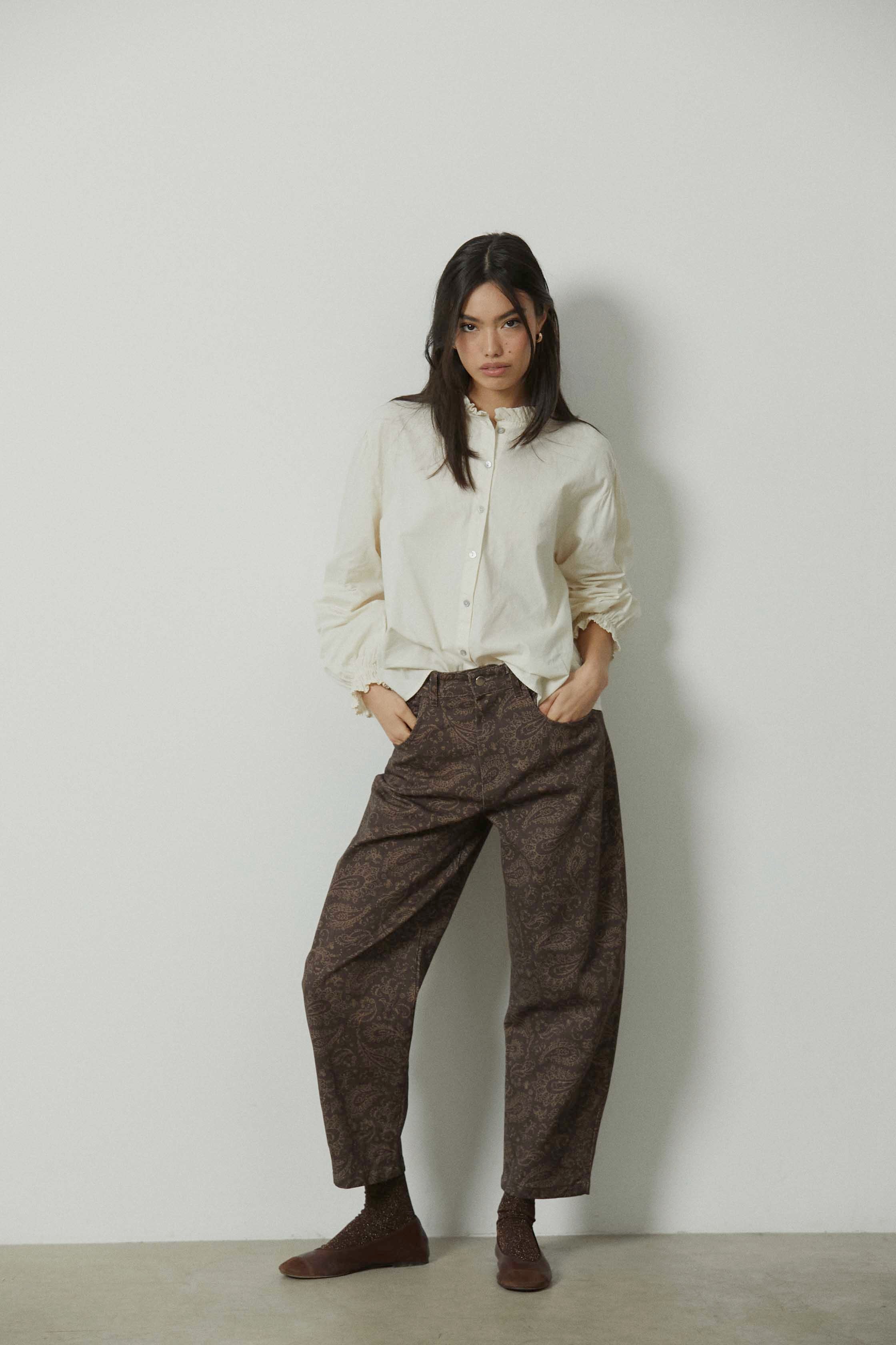 Pantalón de silueta barrel en color marrón con estampado paisley. Tiro medio y pierna ligeramente curvada que aporta un volumen suave y actual, manteniendo la comodidad en el uso diario. Un diseño pensado para el entretiempo y el adelanto de primavera, fácil de integrar en looks relajados.
