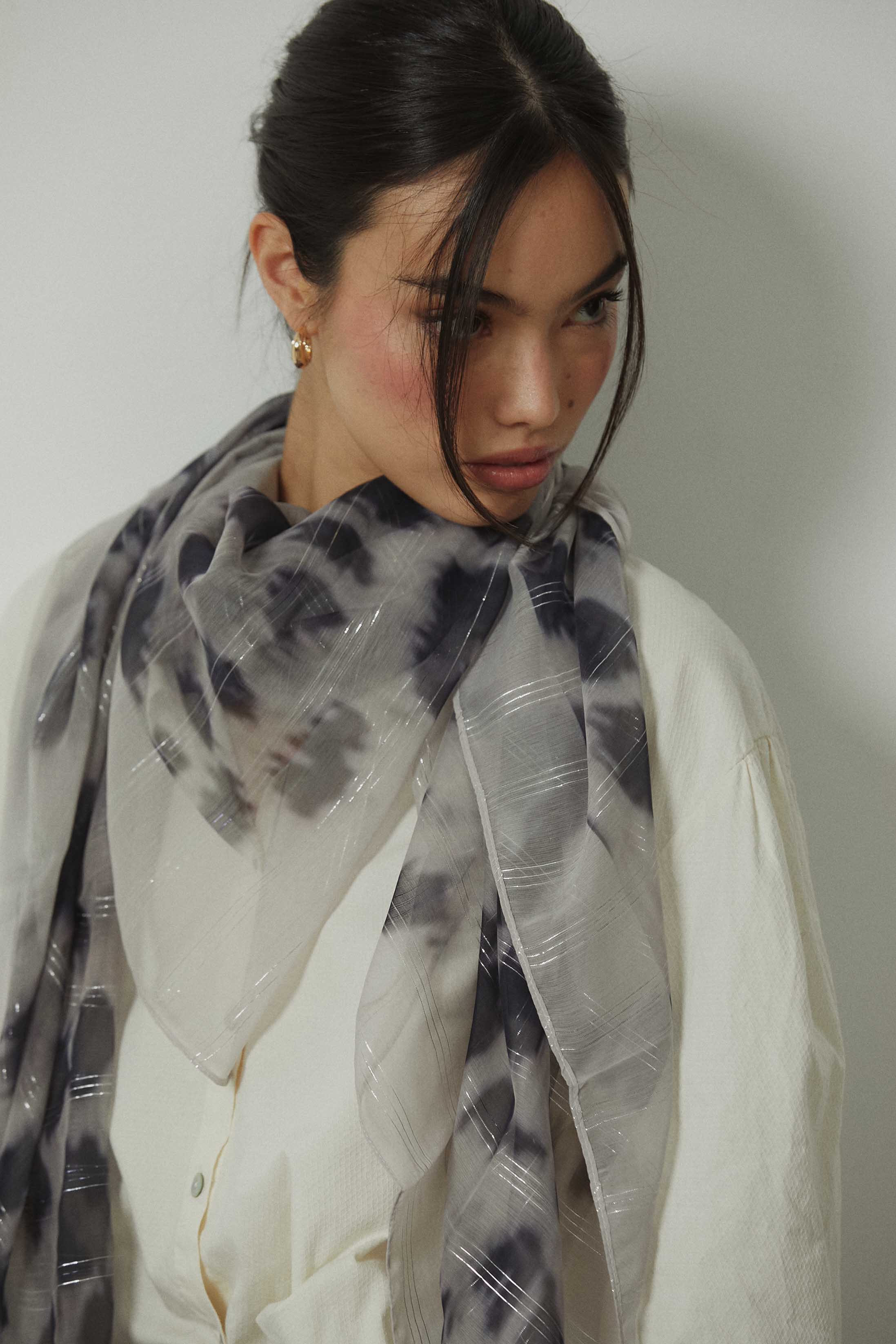 Pañuelo grande en tonos grises con efecto degradado y sutil hilo metalizado que aporta un acabado luminoso. Formato amplio y ligero, pensado para envolver el cuello con soltura o llevarlo sobre los hombros. Caída fluida y diseño que suma textura sin recargar el look.