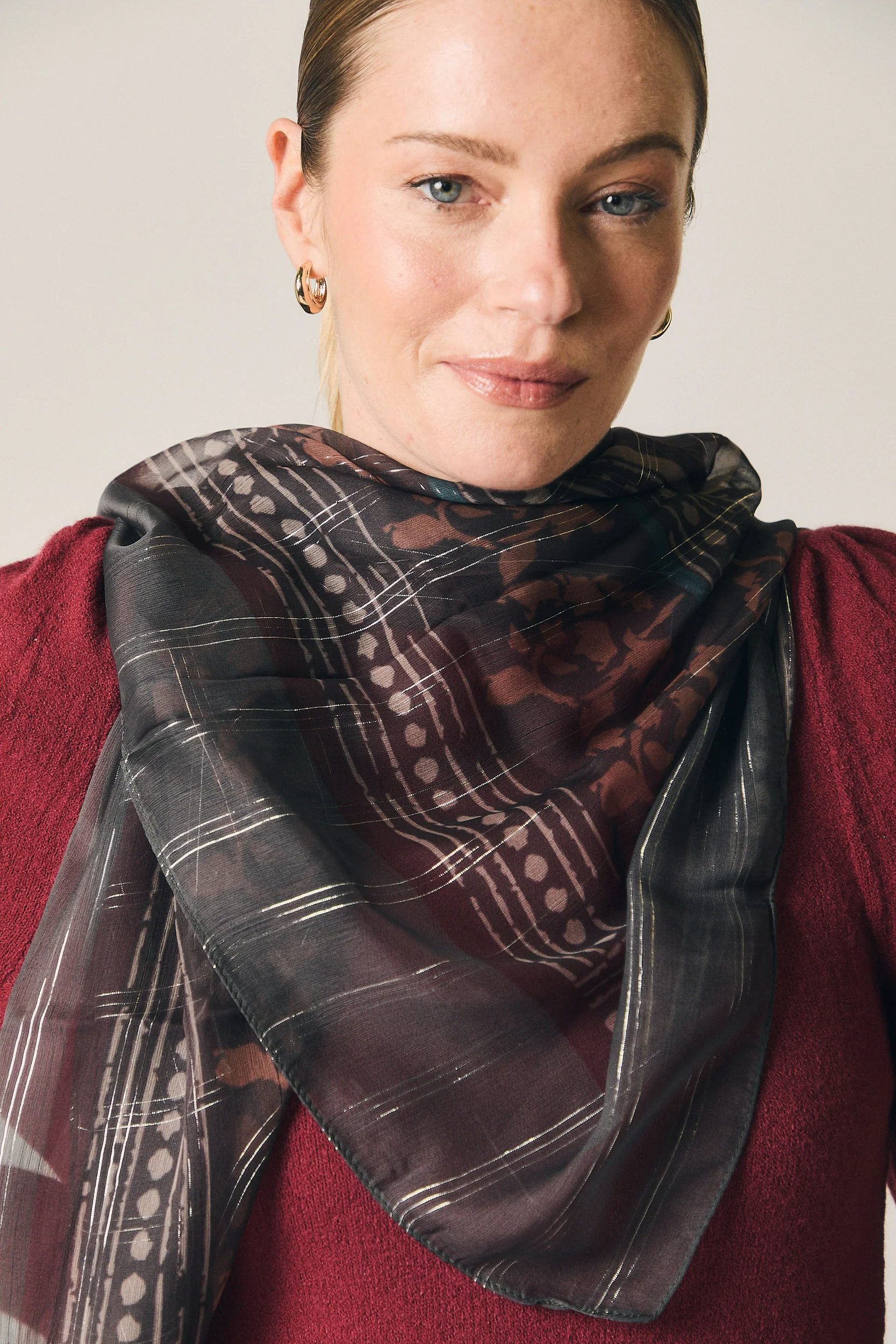 Foulard ligero en tonos gris y marrón con estampado patchwork que combina motivos geométricos, líneas finas y detalles florales. Formato rectangular y caída suave, pensado para llevar anudado al cuello, suelto sobre los hombros o como complemento en looks de diario. Un accesorio versátil que suma color y textura sin recargar.