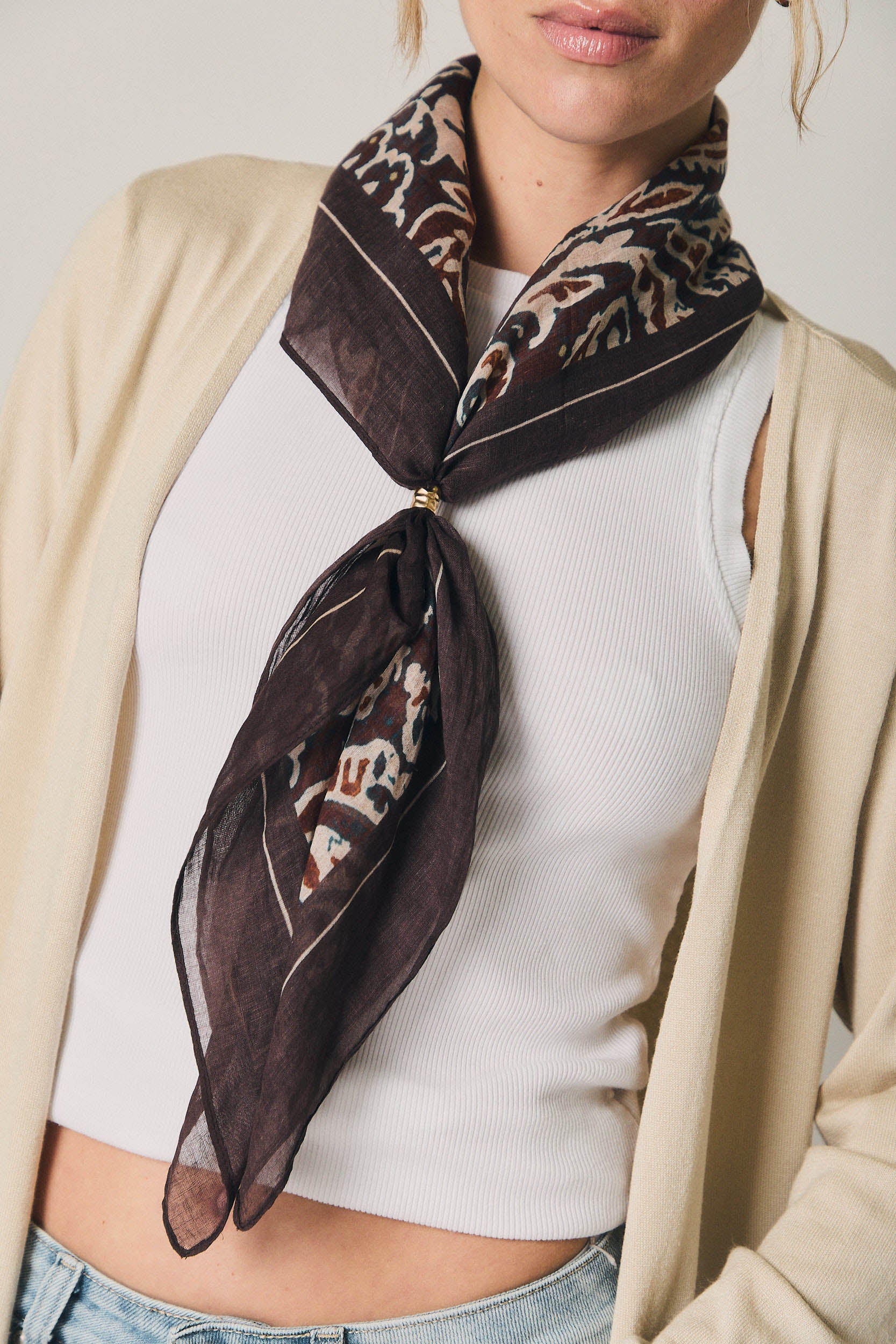 Pañuelo pequeño con estampado paisley en tonos marrones y crudos. Formato ligero y versátil, pensado para llevar al cuello, en el pelo o como detalle en bolsos y cinturones. Diseño cuidado que aporta un punto de contraste sin recargar el conjunto.