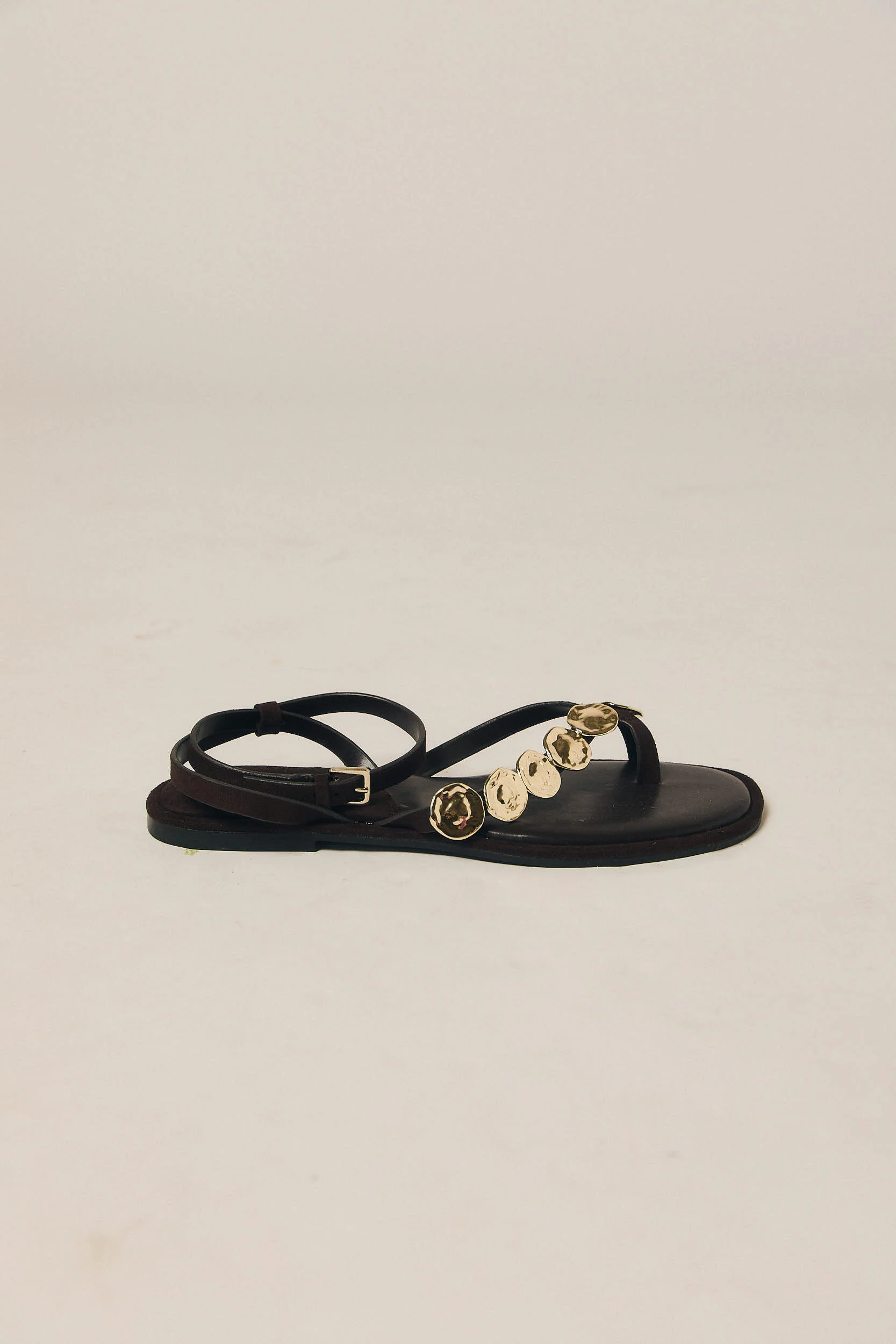 Sandalia plana en color marrón chocolate con tira central y sujeción al tobillo mediante pulsera con hebilla. Detalle de monedas metálicas en acabado dorado sobre el empeine. Planta lisa y suela fina.