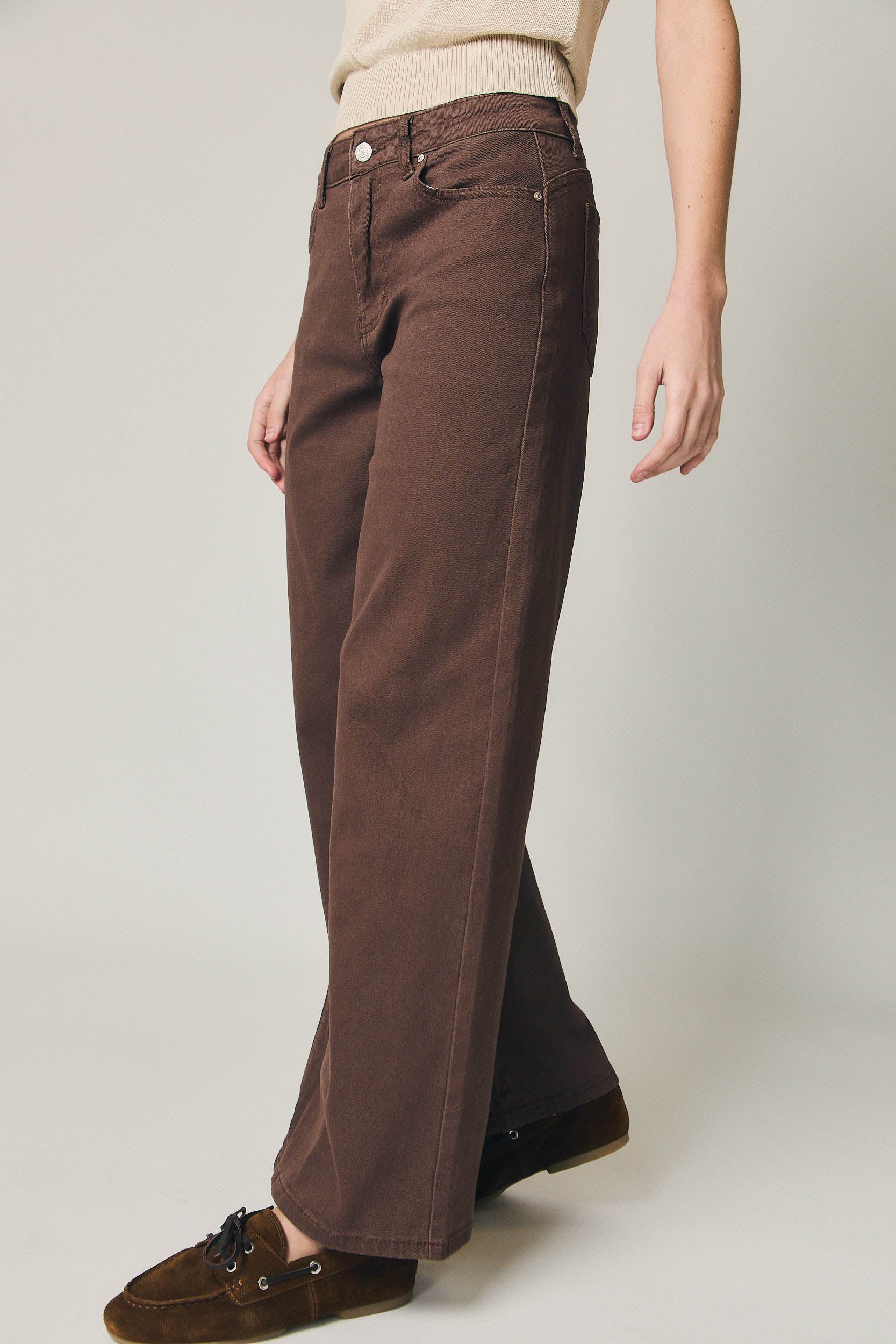 Jeans de corte recto en color marrón, con tiro medio y silueta limpia que estiliza sin ajustar. Presentan diseño clásico de cinco bolsillos, cierre frontal con botón y cremallera y pernera recta hasta el bajo. Un modelo fácil de integrar en el armario diario, pensado para acompañar looks relajados o más cuidados.
