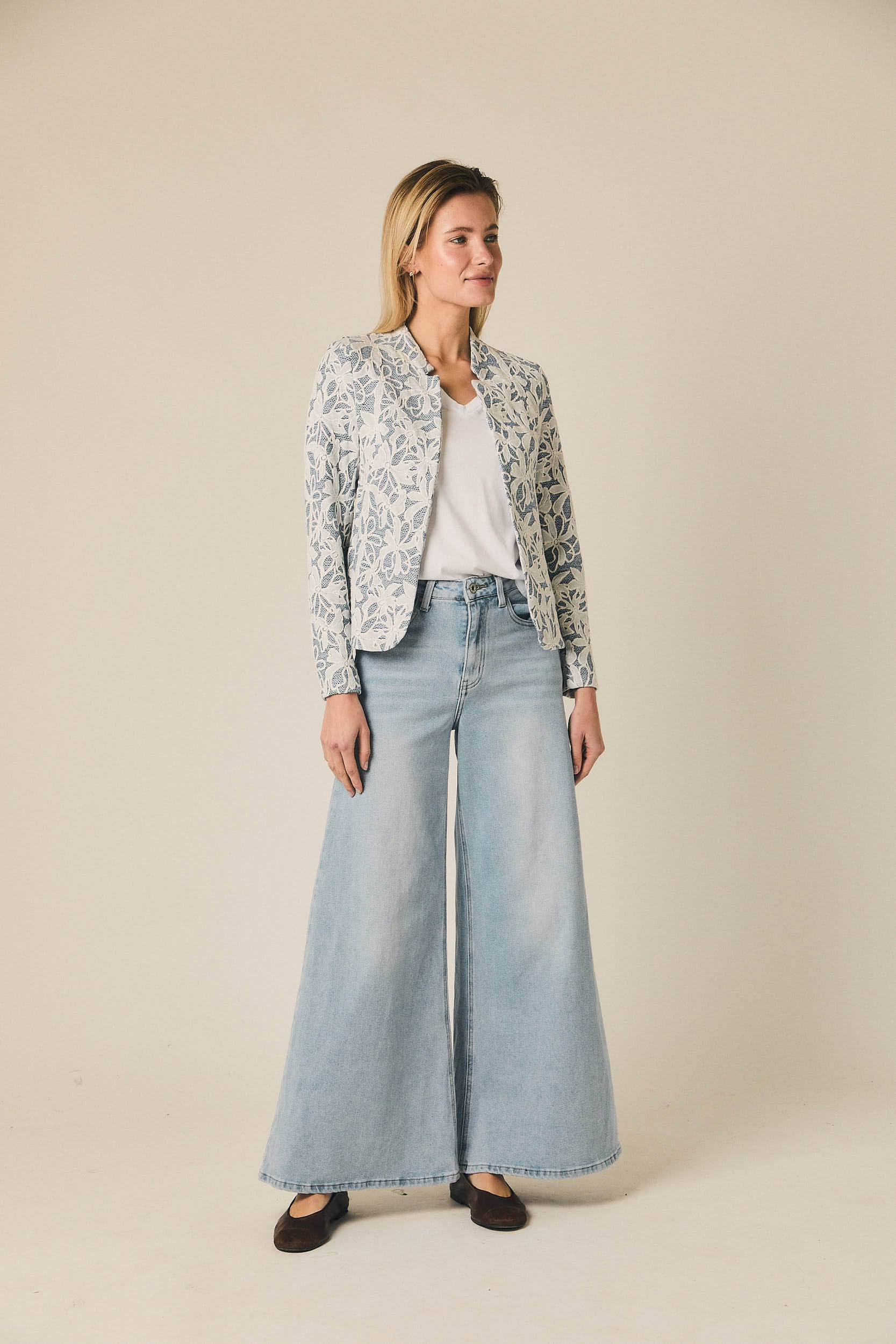 Jeans en tono azul con tiro alto y pernera extra ancha. Diseño de líneas limpias, con cintura bien definida y caída amplia desde la cadera hasta el bajo, creando una silueta fluida y marcada. El largo aporta presencia al conjunto y equilibra el volumen del pantalón, manteniendo un estilo actual y fácil de llevar.