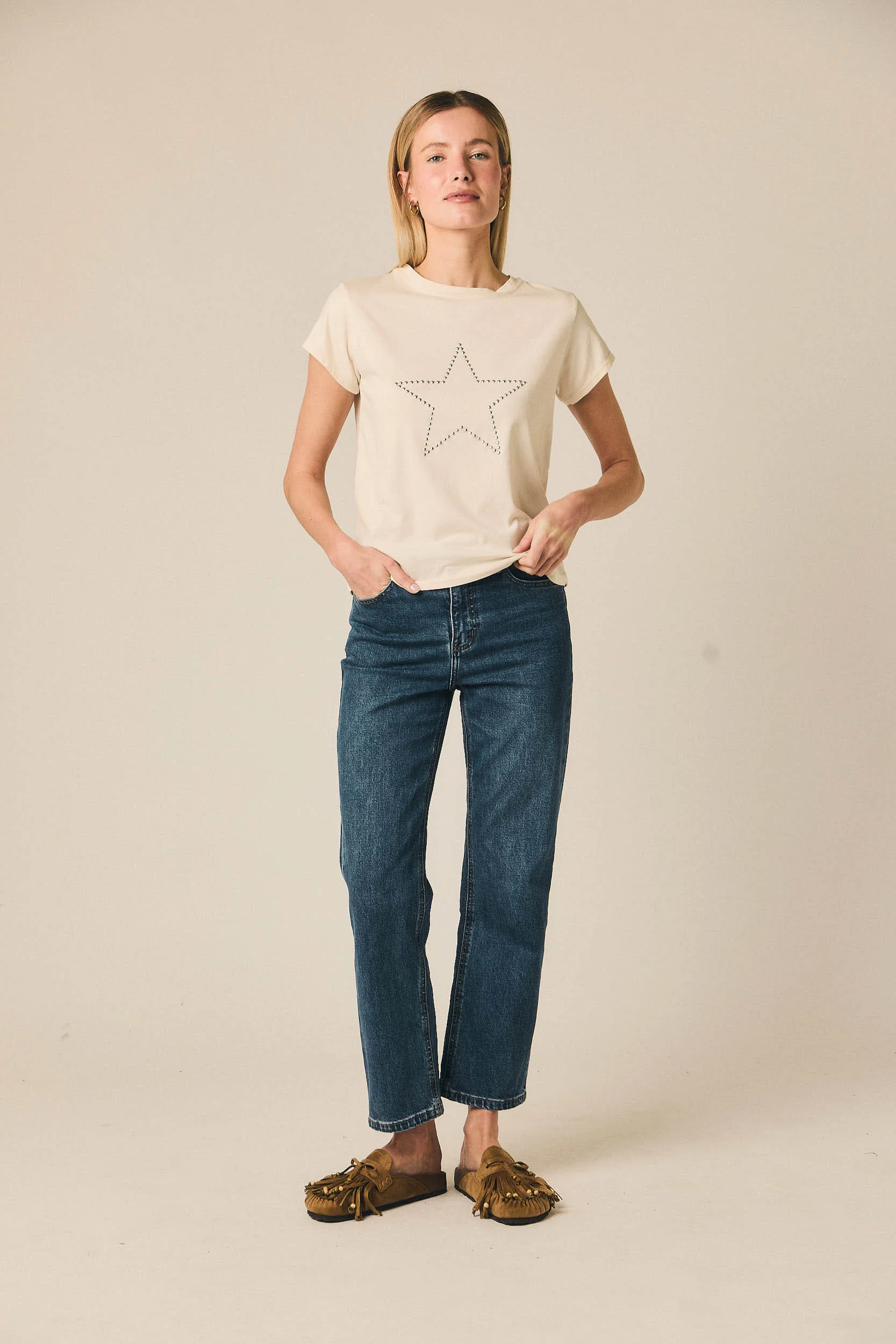 Un vaquero pensado para el día a día, fácil de integrar en cualquier armario. Combina bien con blusas fluidas, camisas de rayas o jerseys de punto, funcionando igual de bien en looks informales como en conjuntos más cuidados para el trabajo o el fin de semana.
