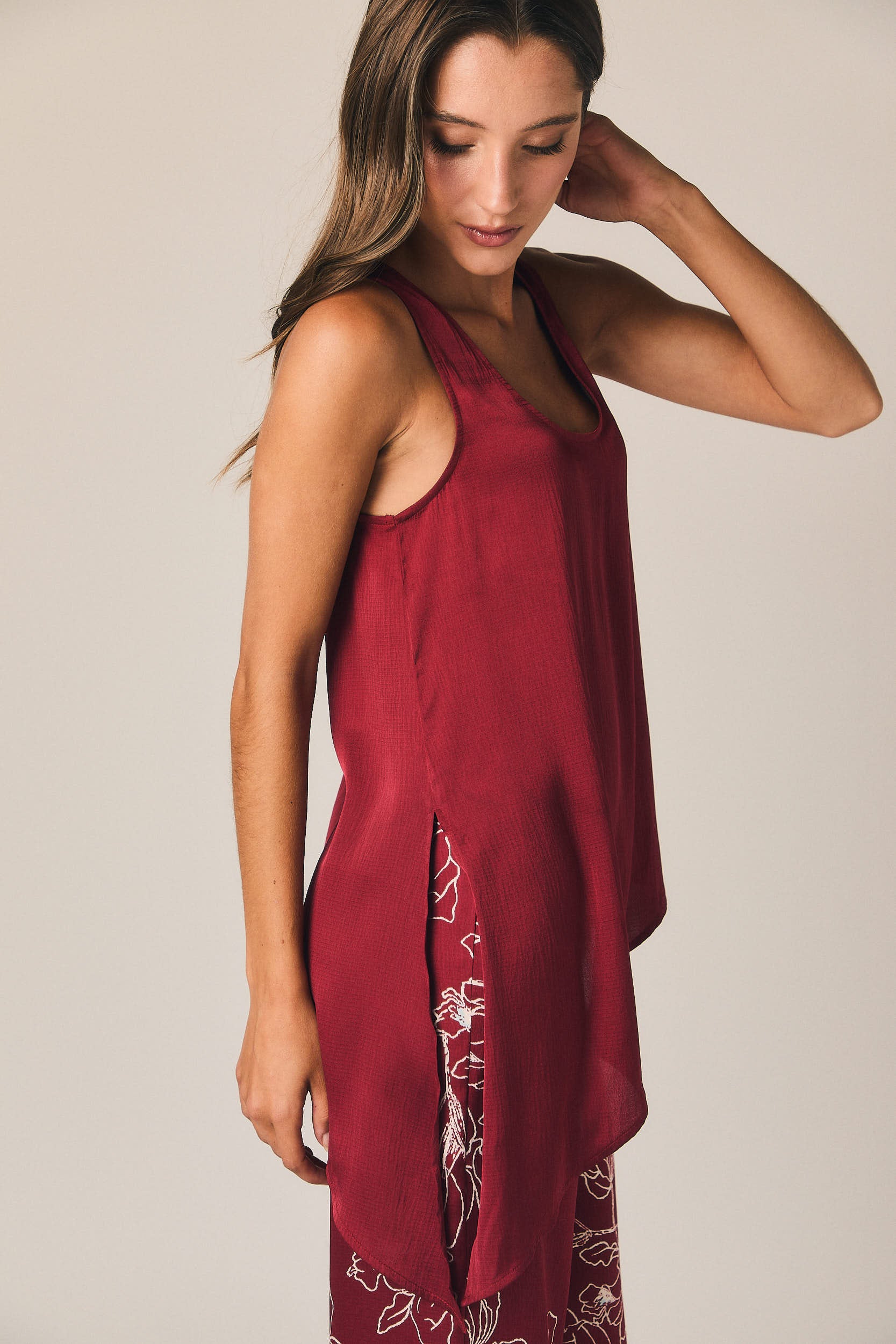 Top sin mangas en tono vino con escote redondo y corte fluido. Diseño con bajo asimétrico en pico que aporta movimiento y caída ligera. Silueta suelta que se adapta al cuerpo sin ajustar.