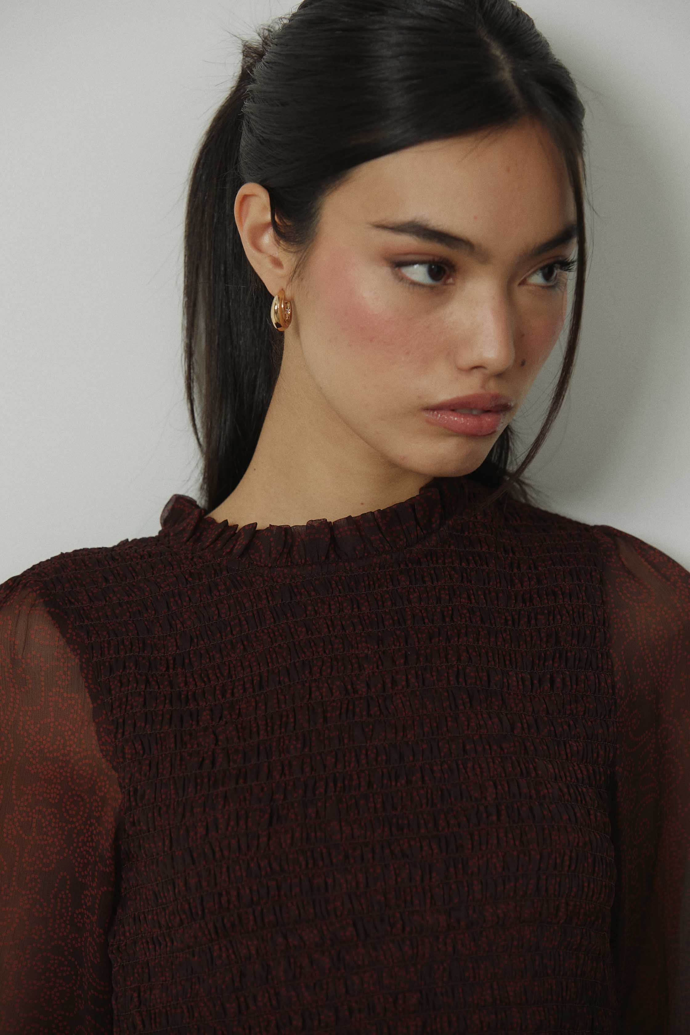 Top de gasa con estampado paisley en tonos marrones. Cuerpo con gomas que se adapta al torso aportando estructura, cuello redondo con ligero frunce y manga larga semitransparente. Bajo con pequeño volante que equilibra el diseño y aporta movimiento. Largo a la cintura.